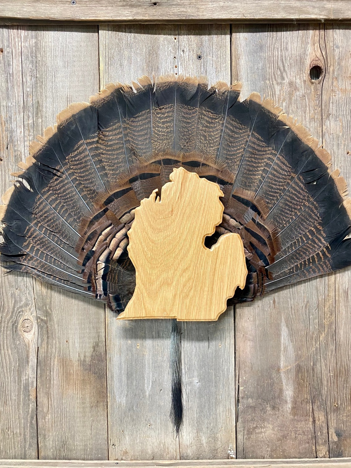 Michigan state turkey fan and beard mount plaque. Includes one fan bracket holder, beard holder and brass hook to hang spurs. Available in oak or barnwood. The rustic barnwood will vary in wood grain-patina. Please allow up to 1-2 weeks for delivery if item is out of stock.