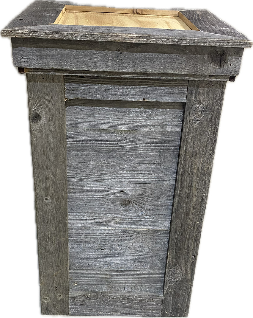Rustic barnwood floor pedestal. Measures 18″ wide x 30″ high. We can change the size to fit your needs, the price will be adjusted accordingly. Please contact us to place order. We can ship to the lower 48 states.